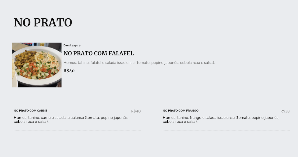 - No Prato: Enjoy distinct platters featuring Homus and tahini paired with falafel, chicken, or meat, all garnished with a refreshing Israeli salad, all priced between R$38.00 to R$40.00.